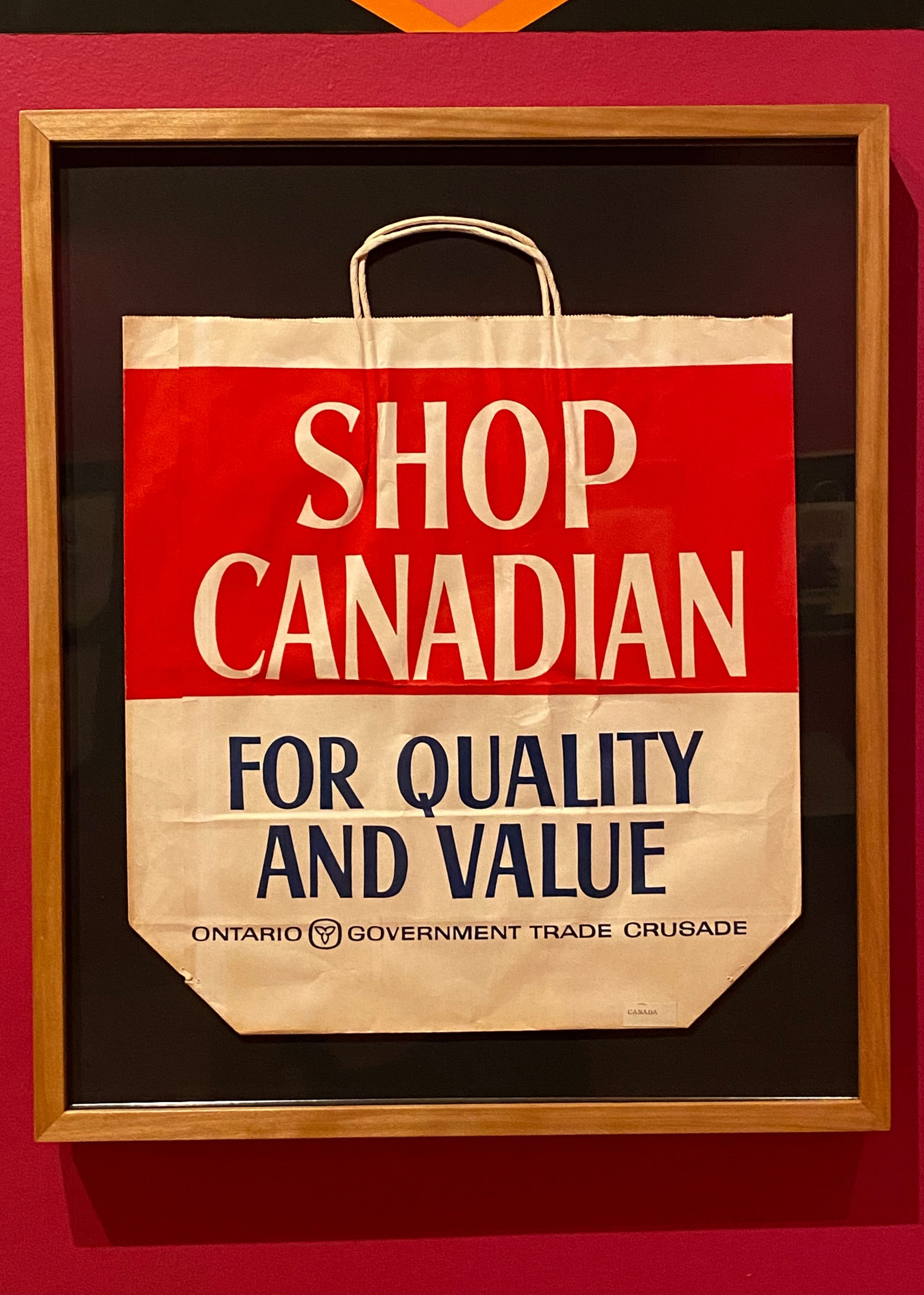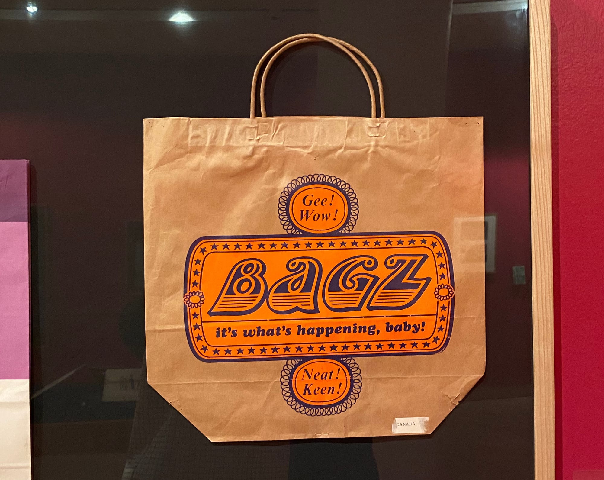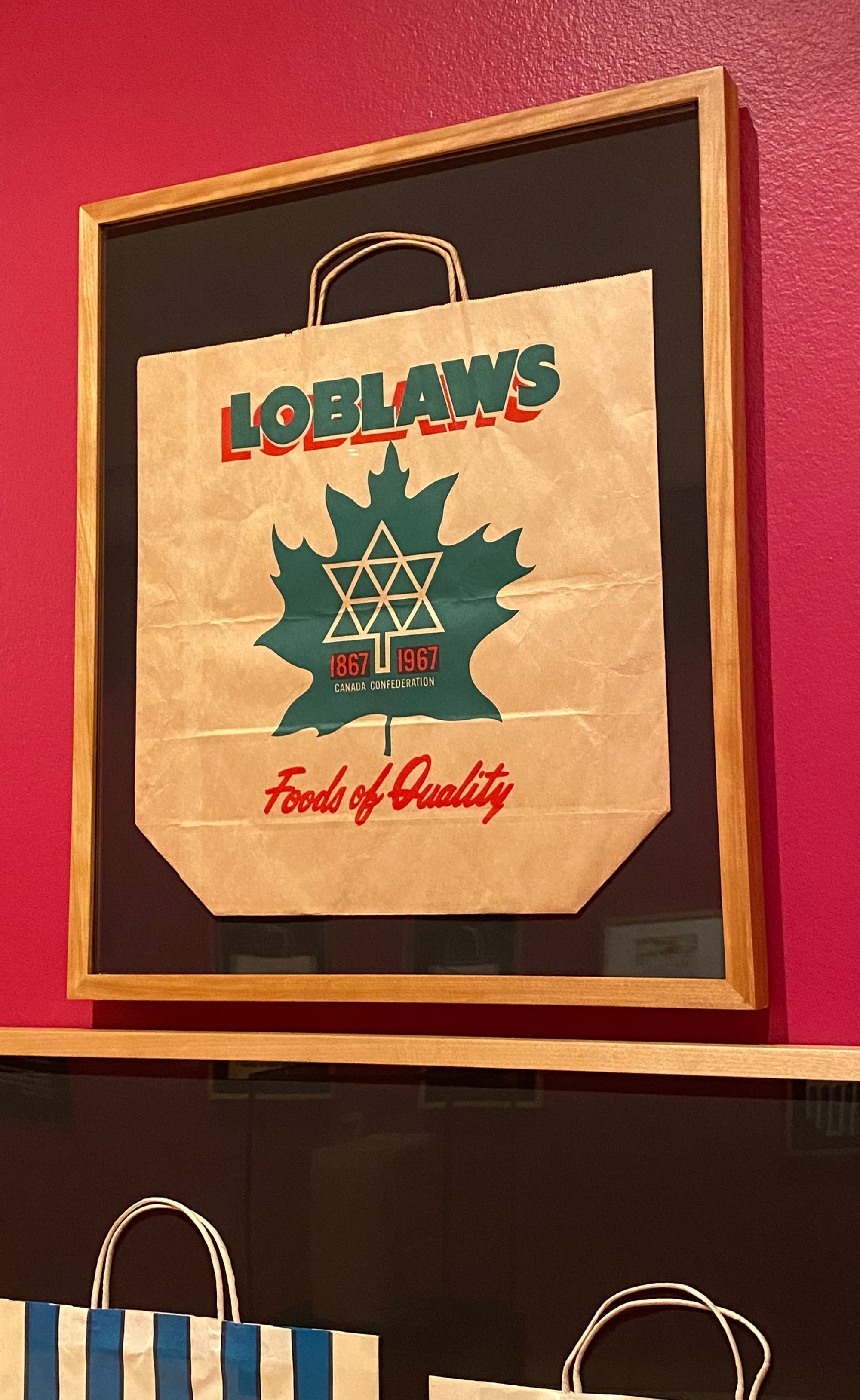 Maybe this intimacy is why bags also lend themselves to patriotic expressions. Here's a Loblaws bag in the exhibition that celebrates our centennial: