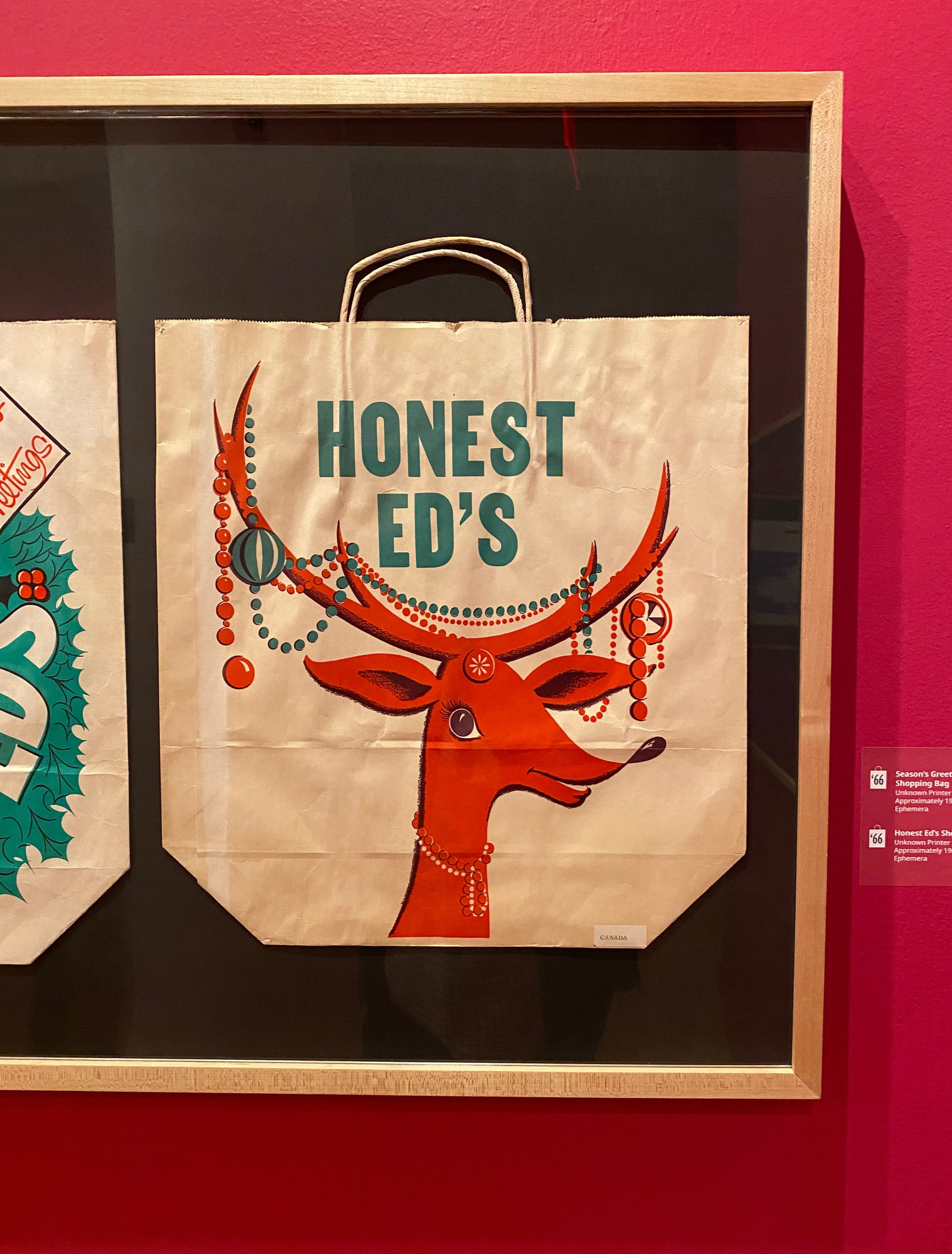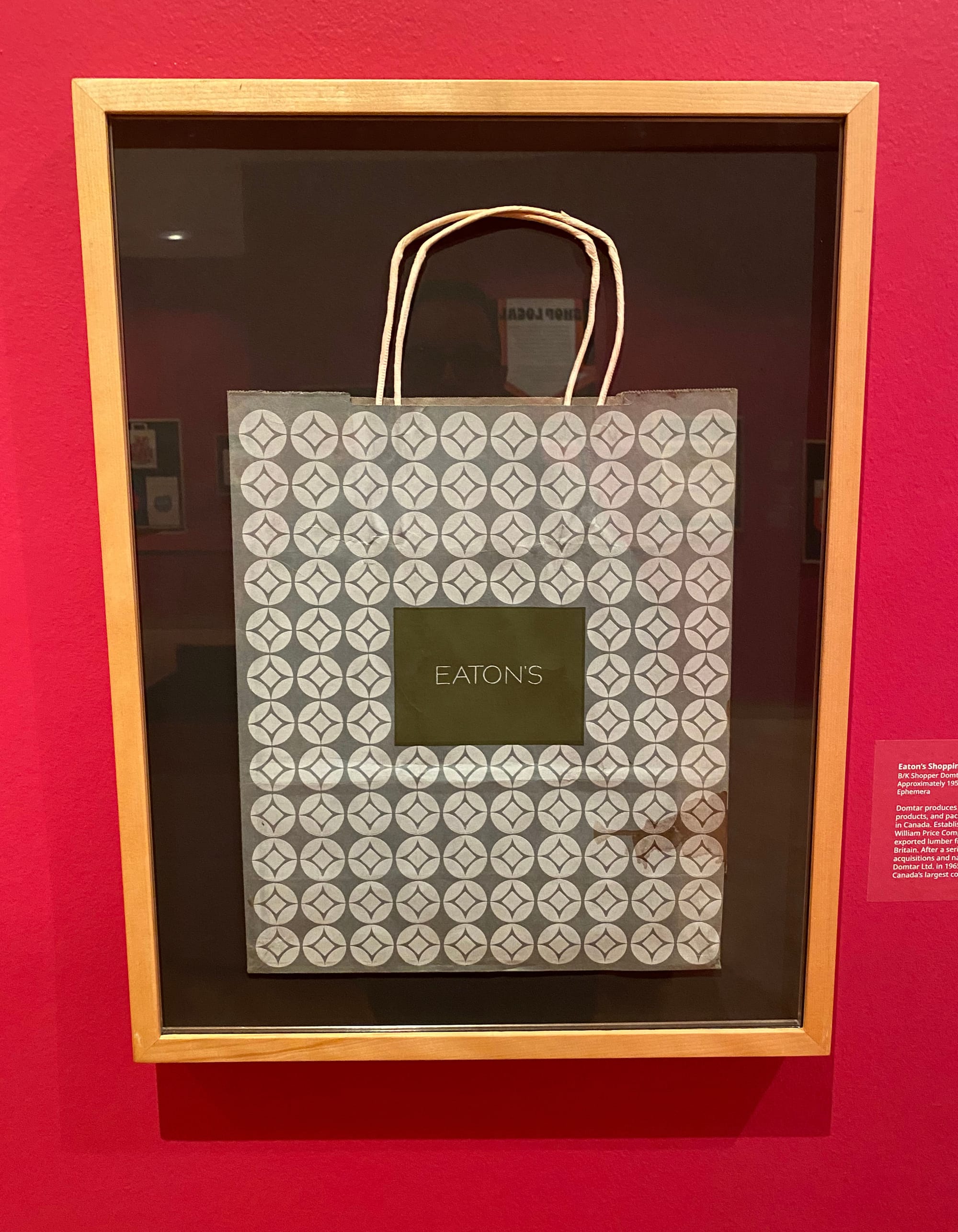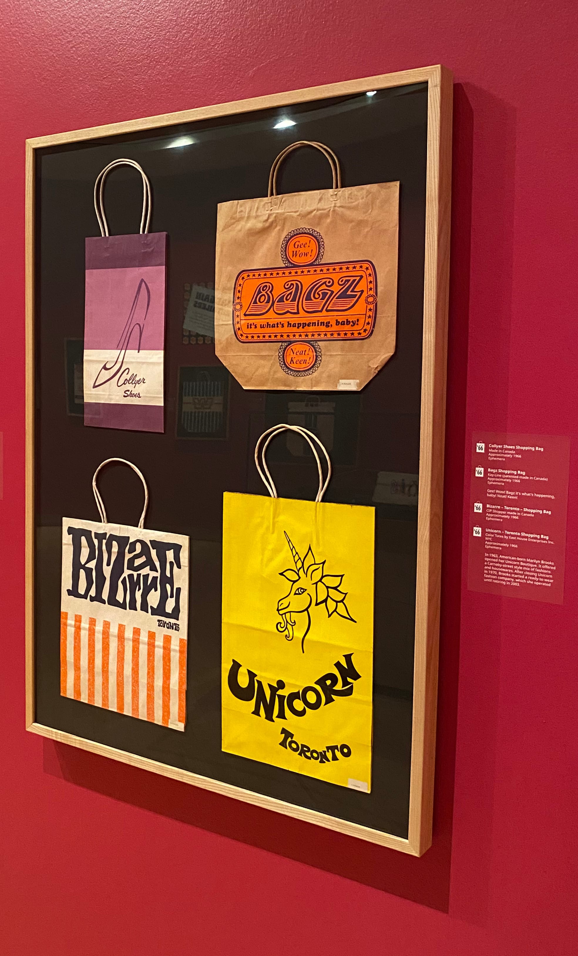 When one of my brothers alerted me to an exhibition of vintage shopping bags at the Toronto Reference Library, it struck me as a savvy curatorial move, given how prevalent yet overlooked these items are in our lives. I toured the exhibition on Saturday, and I'm happy to report that it's a nostalgic roller coaster ride through Canada's retail history. The opening panel sets a lively mood that never lets up: