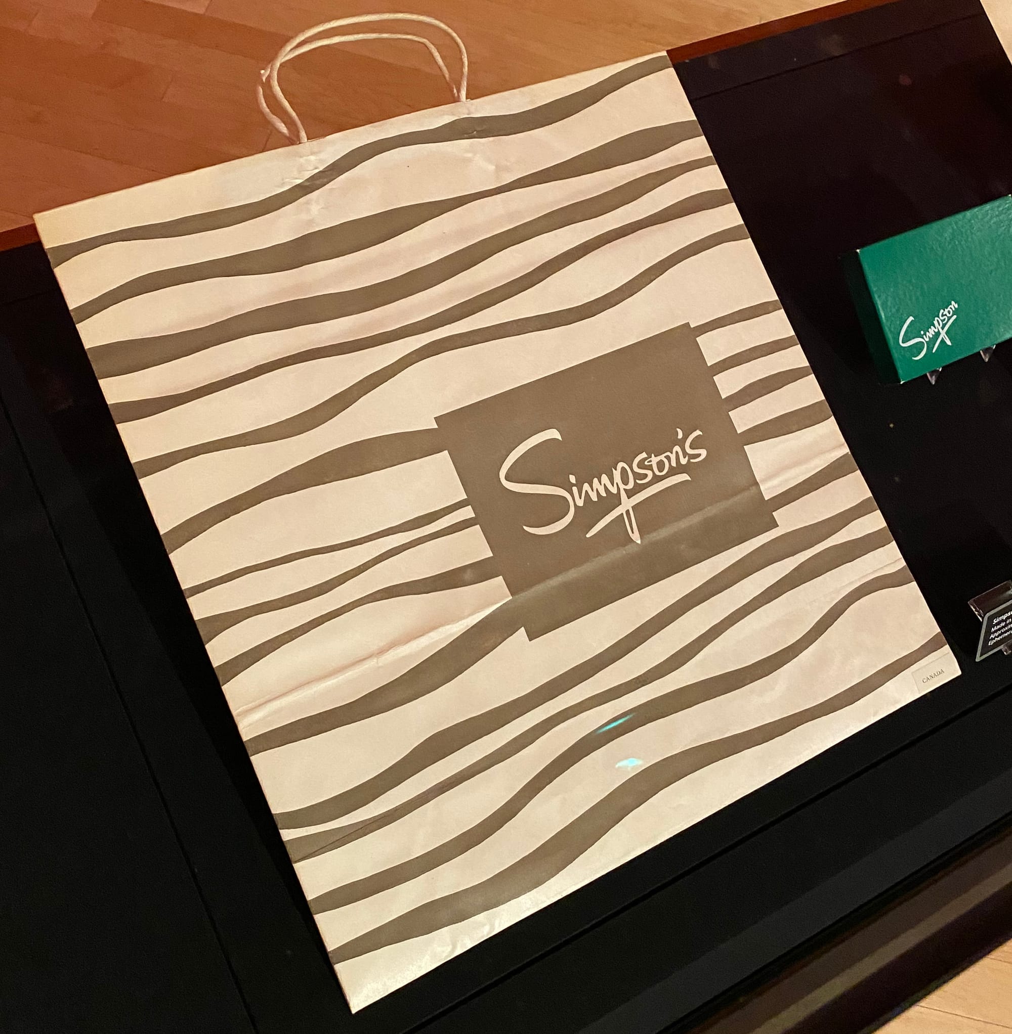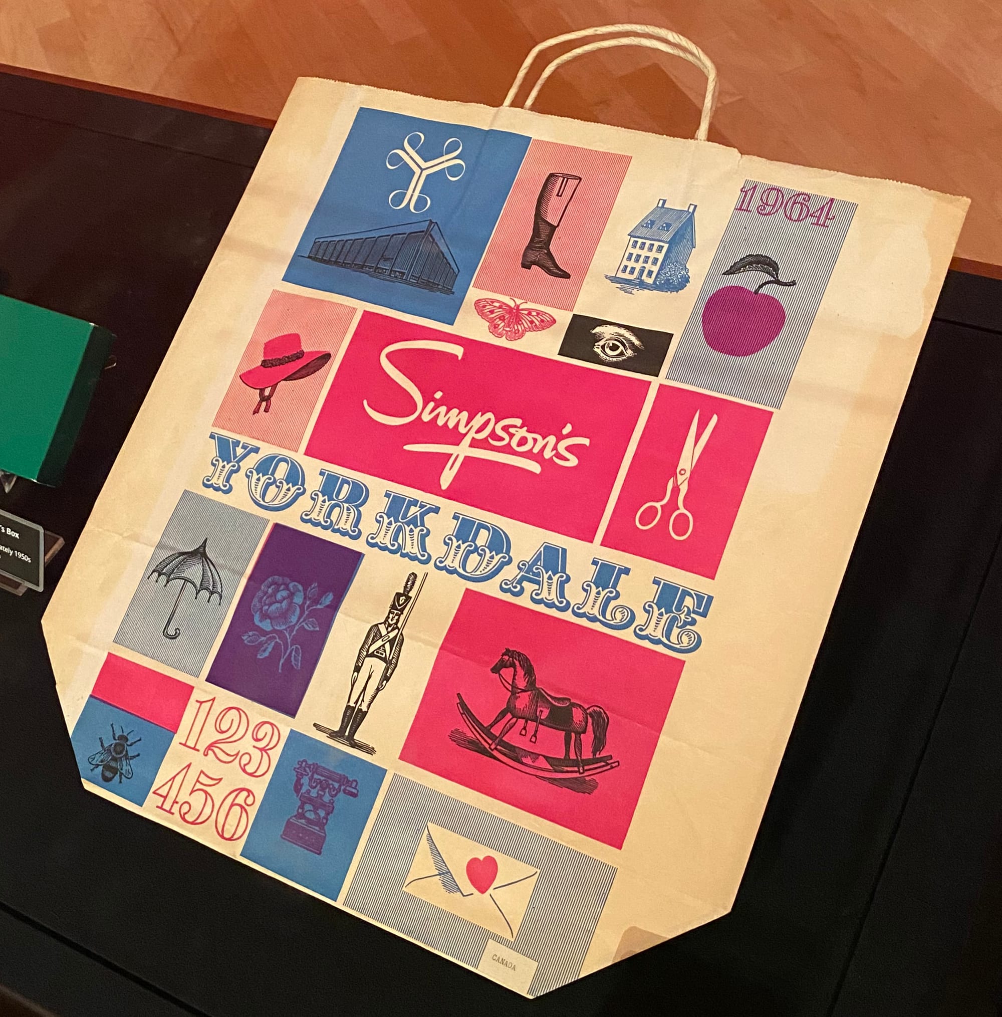 The big department stores are well-represented too. I was surprised at how the geometric grid of an Eaton's bag and the rippling lines of a Simpson's bag seemed to be uncanny windows into my childhood:
