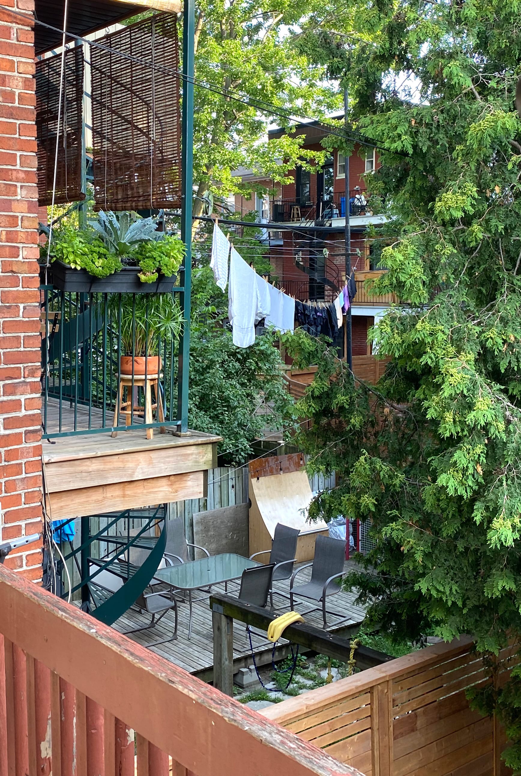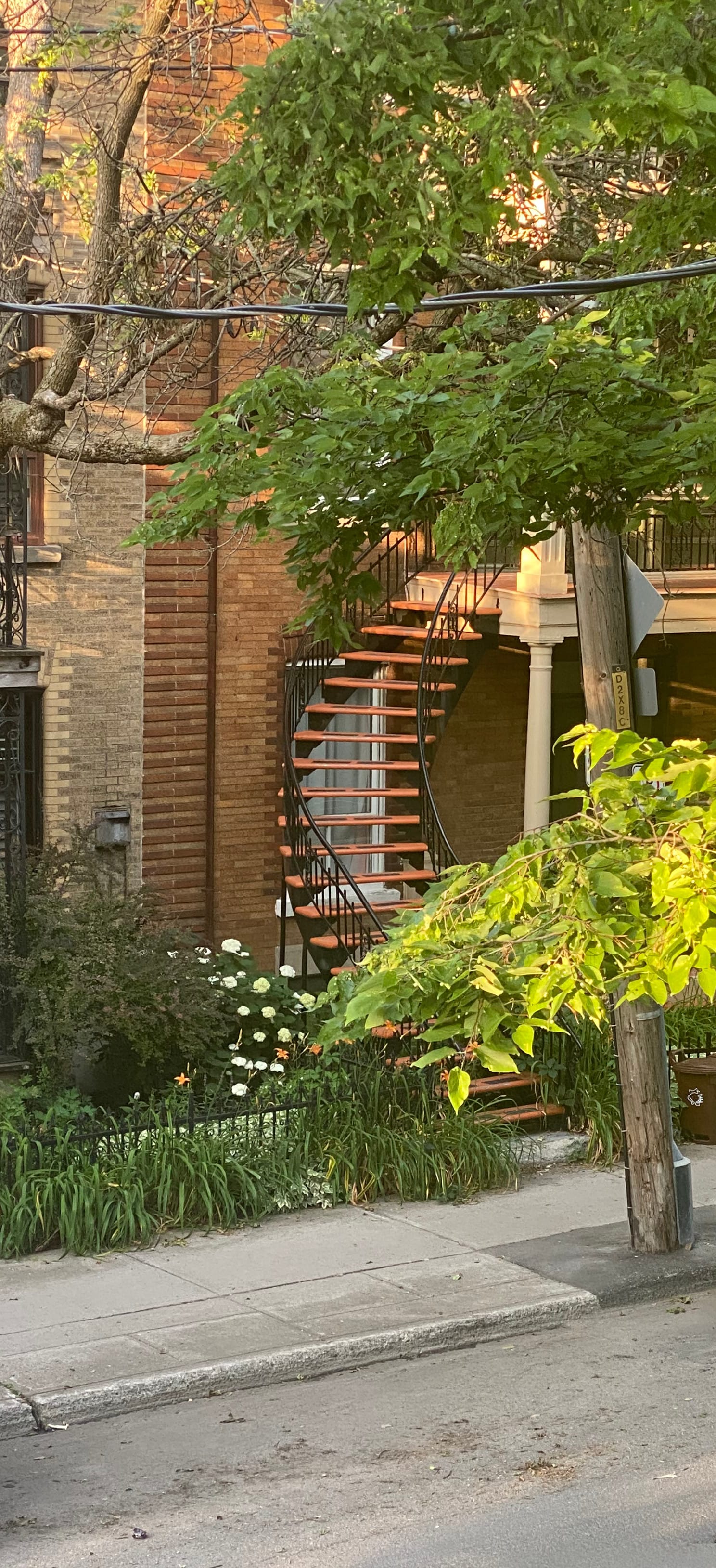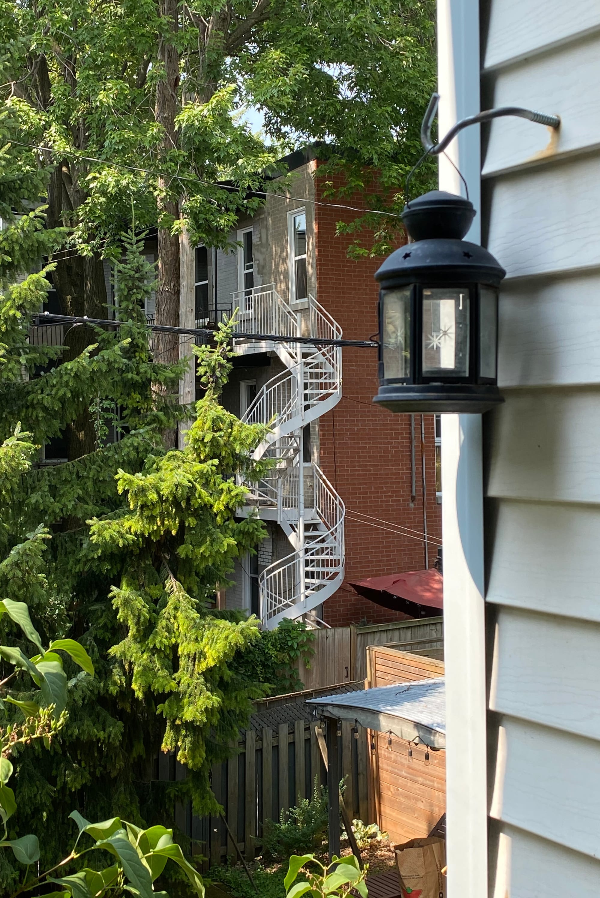 The starting point is satisfying too. I'm on the second floor of a duplex, and the front balcony offers an elevated view of the street. The buildings are no more than three storeys high, and the tallest trees are about four. Curving staircases wind their way up into the foliage:
