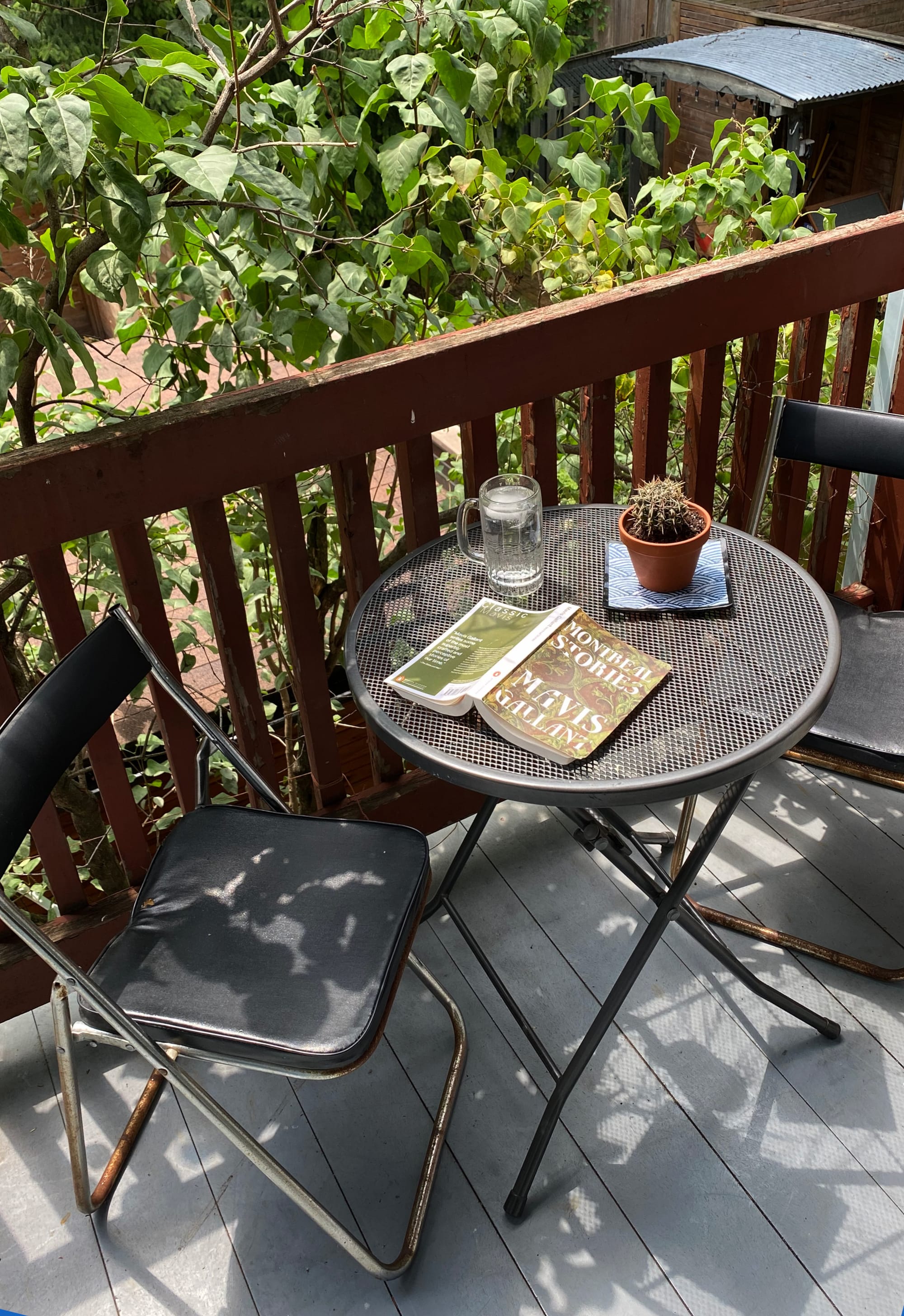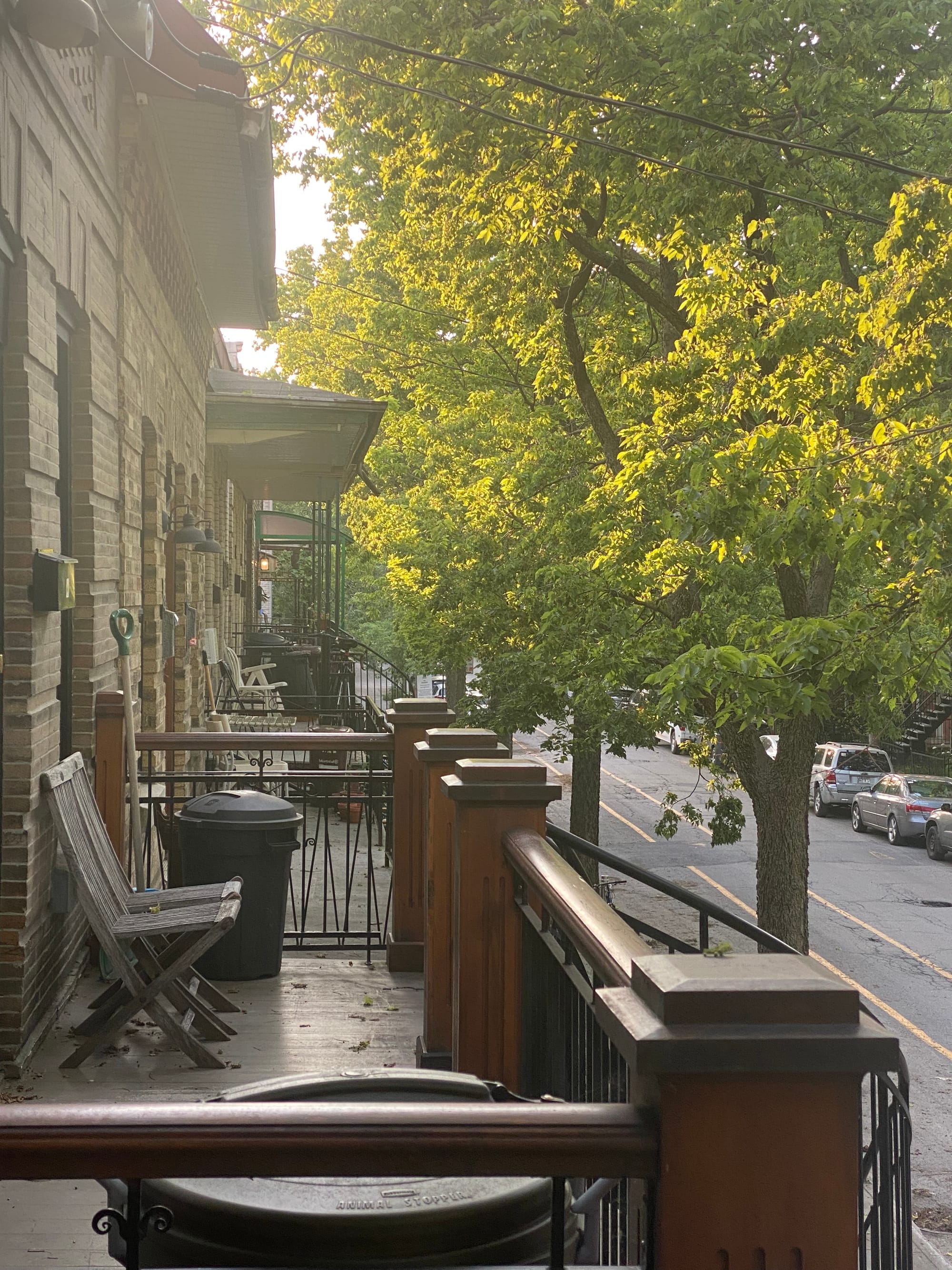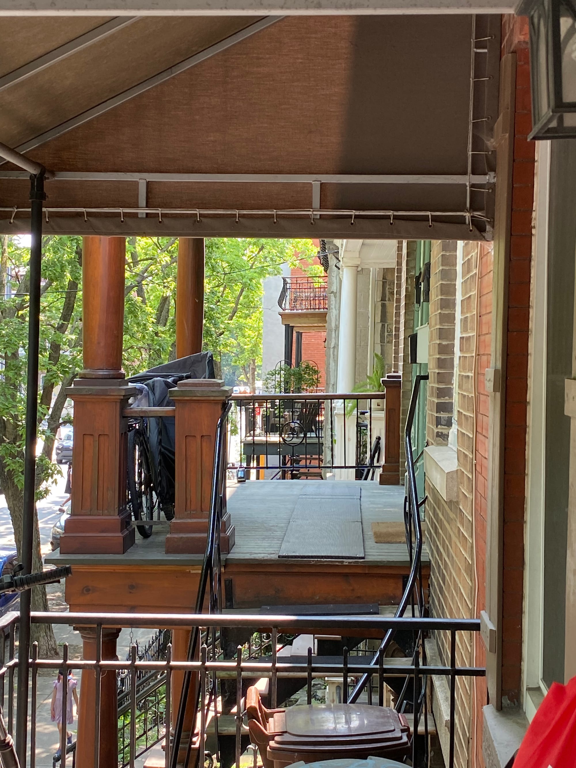 The starting point is satisfying too. I'm on the second floor of a duplex, and the front balcony offers an elevated view of the street. The buildings are no more than three storeys high, and the tallest trees are about four. Curving staircases wind their way up into the foliage:
